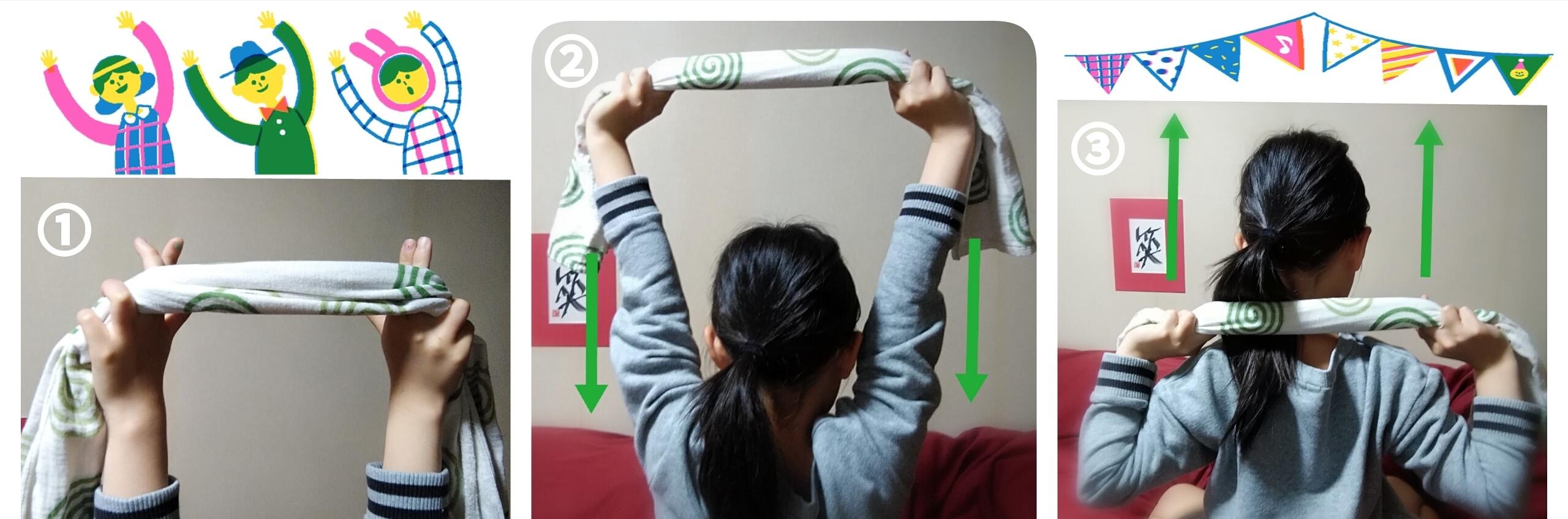 こんにちは。 未病から健康へ二人三脚で目指す整顔フットケア整体サロン『めぐり~meguri~』唐沢 泉です。 ![]() それってきっと 私を診(み)て~っていうカラダからのおねだりです(*´艸`) 運動系のアドバイスは、いろんな専門の方がたくさん動画で紹介してくださってますから、ありがたいですね♪ ただ…コリ固まってる時にいきなりハードな動きをしてしまうのは、カラダが欲しがってるおねだりとはちょっと違います。 ヘタしたら、余計にフリーズしてしまうこともあるんです(+o+) いきなりジャンプではなく、まずホップ・ステップ・ジャンプのホップです♪ はい 今回のテーマはストレッチです(*´з`) 普段していた肩甲骨まわりの簡単なストレッチと、テレビで紹介されてたポイントをコラボさせてみたら、前よりいいかもって状態になってきたので紹介させていただこうと思いまして… 急遽、小っちゃいモデルさんにご協力いただきましたo(^∇^)o姪っ子です♪ トータル5分くらいの~ ◆◆簡単タオルストレッチ◆◆ 立って▪座って…どちらでもOK! ~肩甲骨まわり~ ![]() 準備: これから始めるよってことで数回深呼吸。 *口から長ーく吐く方から始めて、鼻から吸うと、たくさん空気が入りやすいです♪ → 詳しいことはこちらも参考にしてください(^-^) ① タオルを中指と薬指の間にはさんで、薬指と小指だけで握る。 親指を使って握ると、前側(親指側の腕~鎖骨の下あたりの筋肉)に力が入ってしまうので、背中側に力が入るように、薬と小指だけで握る。 *立ってする時は、足は肩幅くらいに広げた仁王立ちがいいです。 ② ①のままバンザイをして、肩甲骨を寄せながら、息を吸いながらゆっくり下ろす。 ※背中をそらし過ぎない ③ 肩甲骨は寄せたまま、今度は息を吐きながら、できるだけ真上にゆっくり上げていく。 *②③をゆっくり3回ずつしてみる。 ~わき腹から背中~ ※ここからはモデルなしでごめんなさい… ![]() ❶ 息を吐きながら、腕は伸ばしたまま、いけるところまで右にゆっくり倒れていって3秒キープする。 右側(倒れた側)の手でタオルを引っ張ると、左側のわき腹がより伸ばせます。 ※イラストの女の子が右手も上げて、かつタオルを持ってる状態を想像してください ❷ 息を吸いながら、ゆっくりカラダを起こす 。 *❶❷を左側も同じように ❸ 息を吐きながら、今度は❶よりも右手をナナメ前に持っていって、3秒キープする。 つま先を見る感じで右手でタオルを引っ張ると、左側の背中から腰がより伸ばせます。 ➍ 息を吸いながら、ゆっくりカラダを起こす。 *❸➍を左側も同じように。 *❶~➍をゆっくり3回ずつしてみる。 ◆◆タオルなしで肩甲骨まわりのストレッチ◆◆ ![]() ② そこから上~外~やや後ろ(肩甲骨同士が寄ってる)経由で円を描くようにゆっくり5回まわす。 *胸の前に戻ってきた時は、毎回肘同士は近づける。 ※円が乱れててスミマセン…