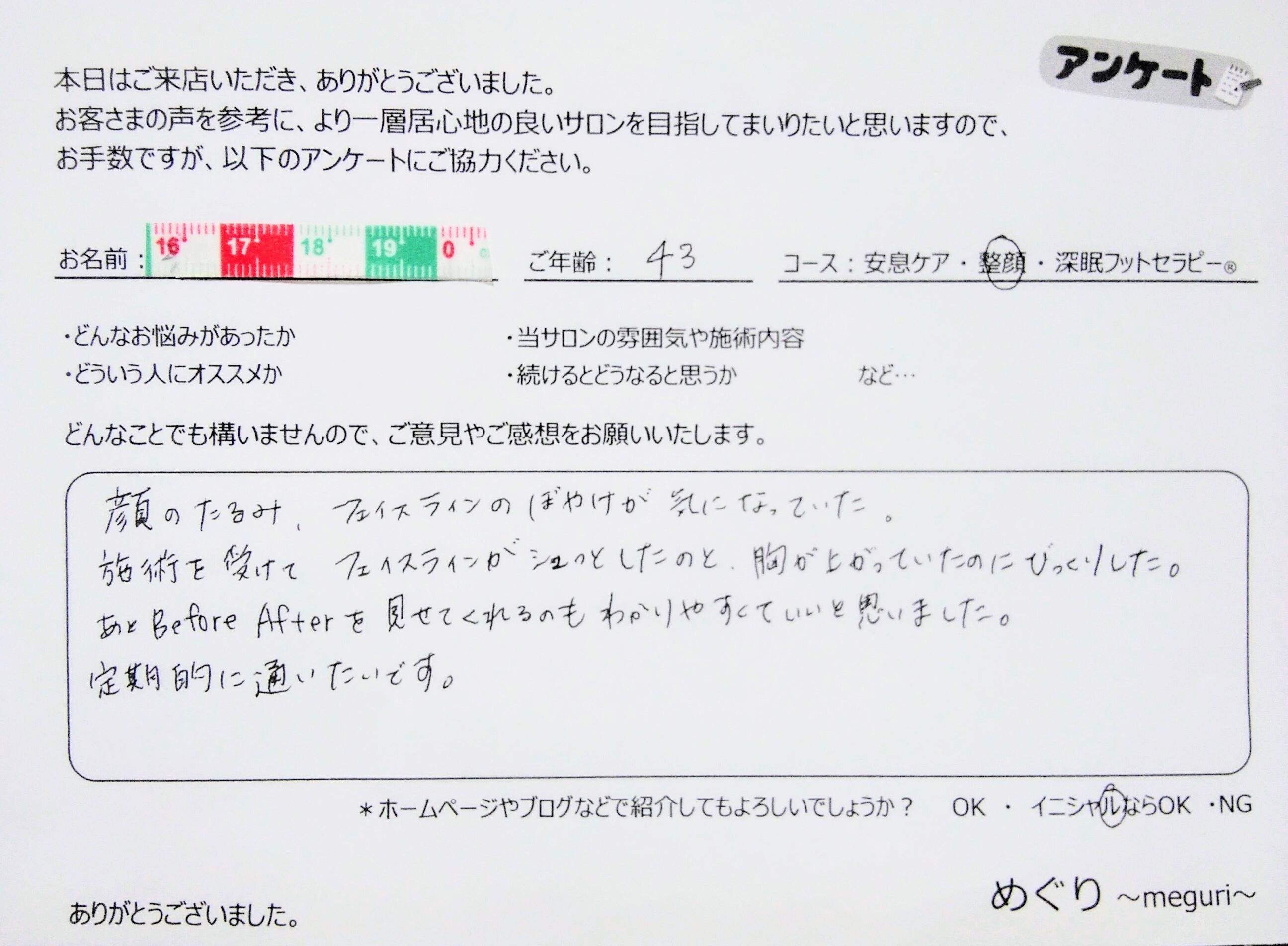 未病から健康へ二人三脚で目指す整顔フットケア整体サロン『めぐり~meguri~』唐沢 泉です。 一日の大半がPC作業かつ在宅ワークが増えたため、顔への意識が減ったんです… だから…(^^;)と『安息ケアコース』をご利用くださるお客さまが、今回初めて『整顔コース』を受けてくださいました(^^)/ ![]() PC作業が苦手な私にとって、お仕事にされてる方…尊敬しかありません(笑) PC作業は特に一日中腕が前に出てるため、カラダの前側が縮こまりやすくなり、お顔にも影響は出やすいです。 ですので上半身をほぐす所から始まる整顔コースは、縮こまった所がホワッとゆるむ…そして余分なモノが流れやすくなりますので、見た目だけでなく軽さも体感していただけます♪ 酷使している目や頭、上半身も軽くなると好評の整顔コース。 PC作業が多い方へもぜひオススメです(´з`) お客さまの声はこちらからも(^^)/ ご相談はお気軽に♪ LINE・メールどちらでもお話が出来ます。 来店は完全予約制です。 こちらからお時間をお選びいただきご予約頂けます(^^) *別ウインドウが開きます ![]() |