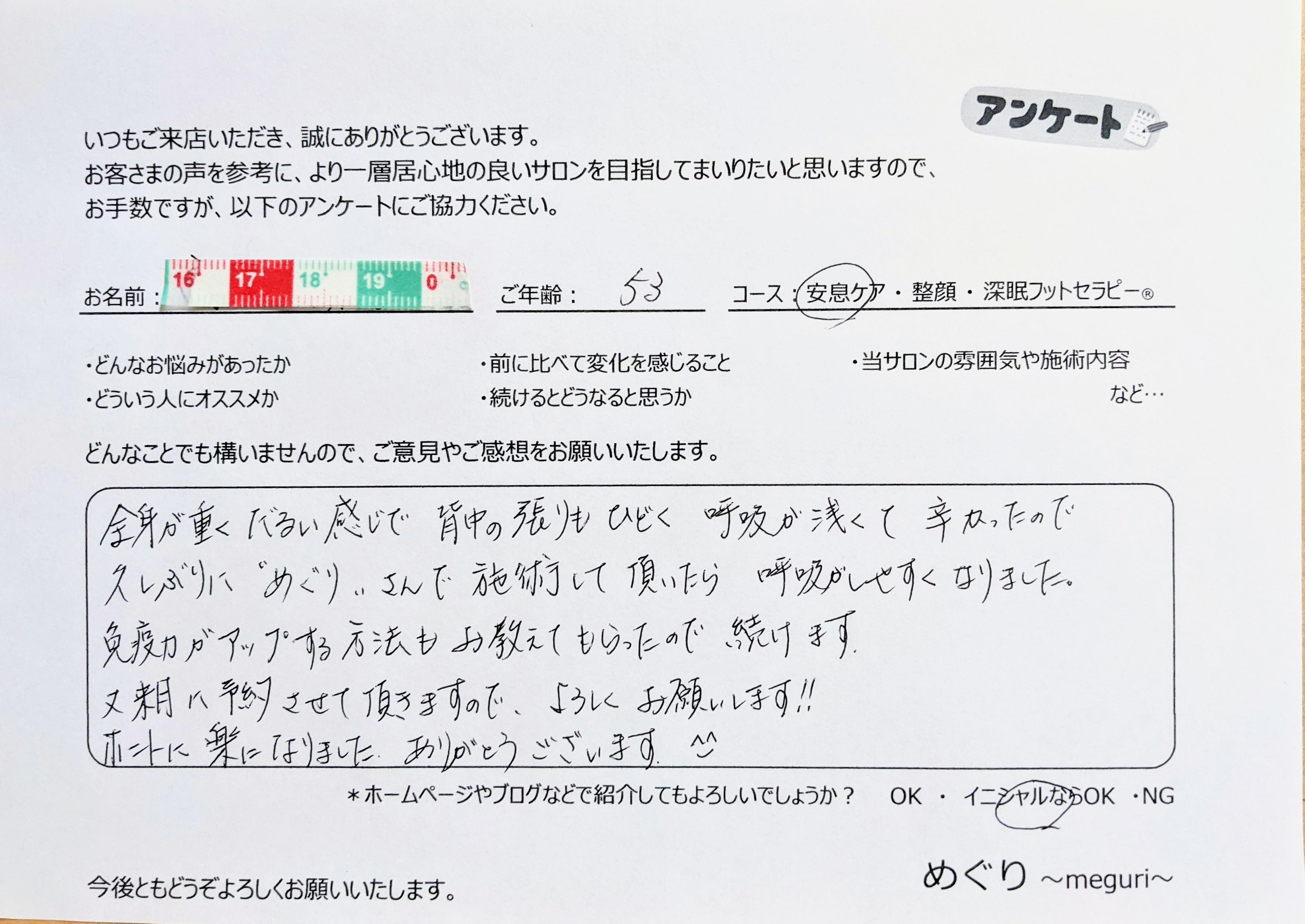 こんにちは。 未病から健康へ二人三脚で目指す整顔フットケア整体サロン『めぐり~meguri~』唐沢 泉です。 「首からお尻まで張ってて…カラダが硬くて痛くてダルいんです」と久しぶりに『安息ケア』を受けに来てくださったお客さま… ![]() お仕事では立ち仕事が多いとのことで、実際は背中や足が張ってるだけじゃなく、胸(肋骨)のあたりまで硬さがありました。そうなると呼吸も浅くなってしまいます(ᗒᗩᗕ) カラダが酸欠状態… そうなるとカラダに硬さが出て痛みとしても感じやすくなり、眠りも浅くなるしダルさも当然…(;O;) 施術が終わったあとに「私…呼吸してる…今まで呼吸してなかったんだわ」と。 そんな言葉が出てしまう位、緊張感ある状態で頑張られてたんですね… 地味ですがぜひセルフメンテナンスとともに酷使し続けないよう、カラダへ愛情を注ぎ続けてあげてくださいね。 安息ケアについてはこちら♪ ご相談はお気軽に♪ |