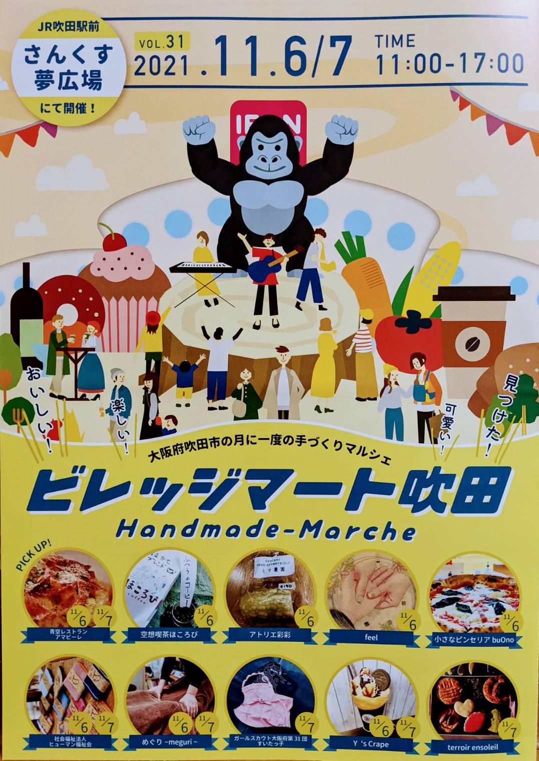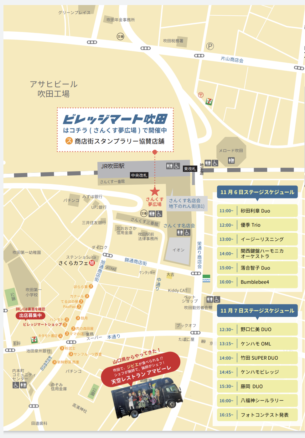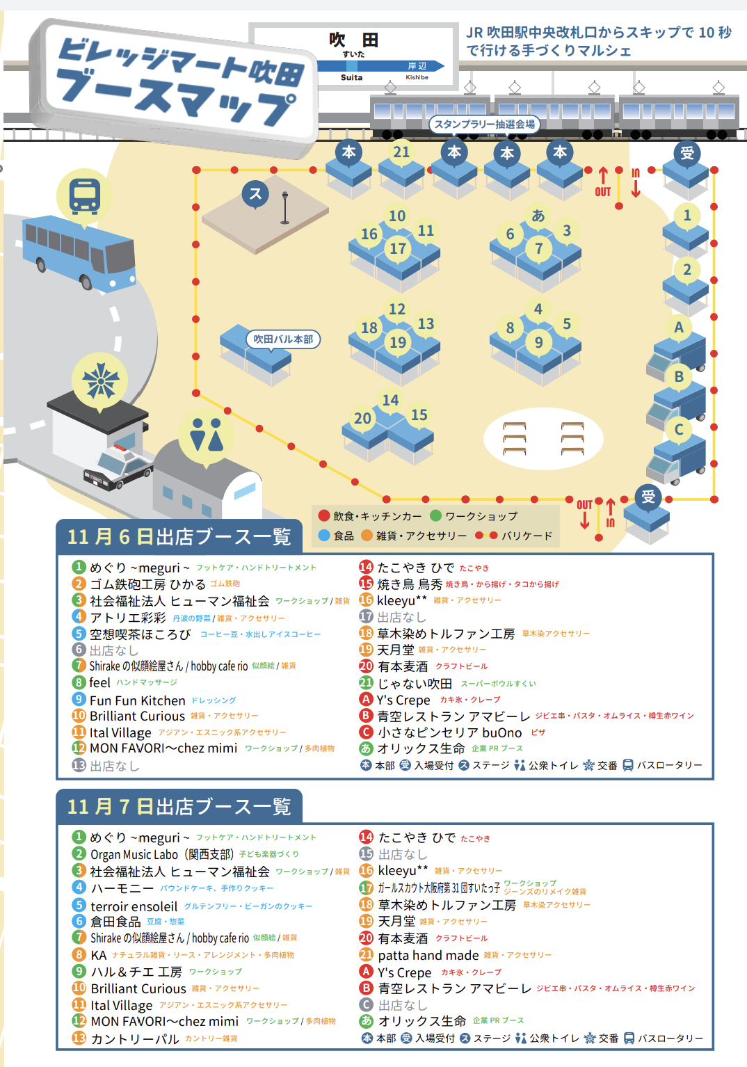 普段は月イチ~16:00までのマルシェですが、11月は吹田バルも同時開催のため、土日連チャン&1時間長い~17:00まで! 飲食・キッチンカーはもちろん、アクセサリー・雑貨屋さんや多肉植物のお店など…ステージ♬もあります。 スタンプラリー(先着順)もありますよ♪ヽ(^o^)丿