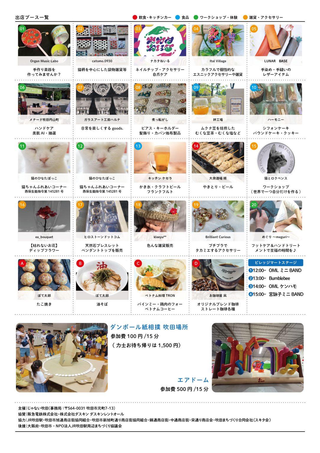 雑貨や飲食だけじゃなく、音楽ステージ、毎月変わる芝生エリアのイベントも楽しみなマルシェです♪ お近くにお越しの際は、ぜひ遊びに来てくださいね(^v^)/ ‥‥‥‥‥‥‥‥‥‥ 日時:2025年5月4日(日) 11:00~16:00 場所:JR吹田駅前のさんくす夢広場 (吹田市朝日町1-10) 当店は20番ブースです ‥‥‥‥‥‥‥‥‥‥ *お支払いは前払いとなります *PayPayもご利用いただけます ※雨天中止の場合、このホームページのトップにお知らせいたします。 お越しくださったみなさま、どうもありがとうございました‼ お天気に恵まれた一日でしたが、風がちょいちょい邪魔してくれて… テーブルの上の飛ばされそうなものを、ハンドトリートメント受けながら押さえてくださるお客さまもいらっしゃいました。 やさしさに感謝感激でした(≧◇≦) 今回のマルシェには、関西万博公式キャラクターの“ミャクミャク”と、吹田市のイメージキャラクターの“すいたん”が来てくれました! 撮りにいっちゃいますよねー、写真… ![]() |